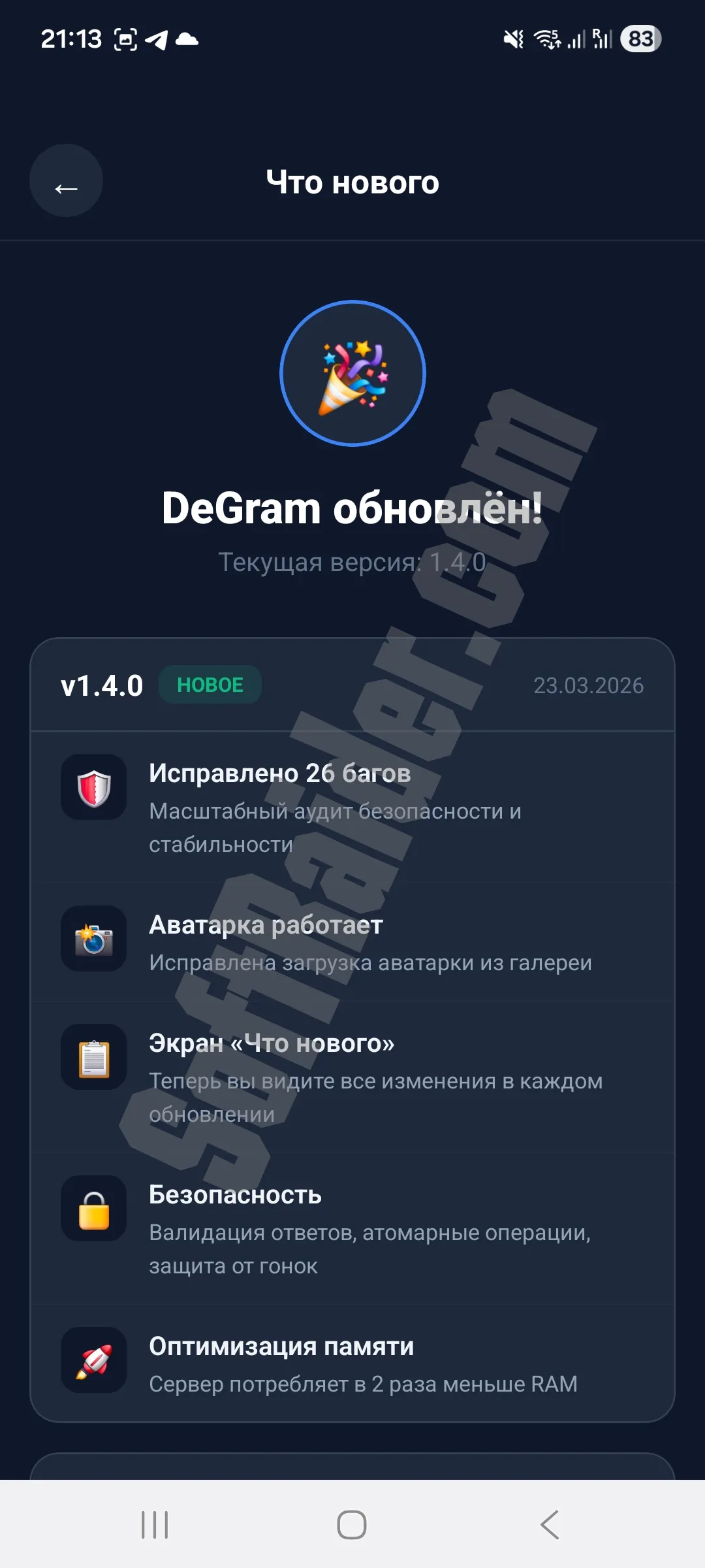 DeGram — современный мессенджер нового поколения, предназначенный для безопасного и быстрого общения. Основная цель — обеспечить полную конфиденциальность пользователей без ограничений и цензуры. Программа доступна для устройств на Android бесплатно.