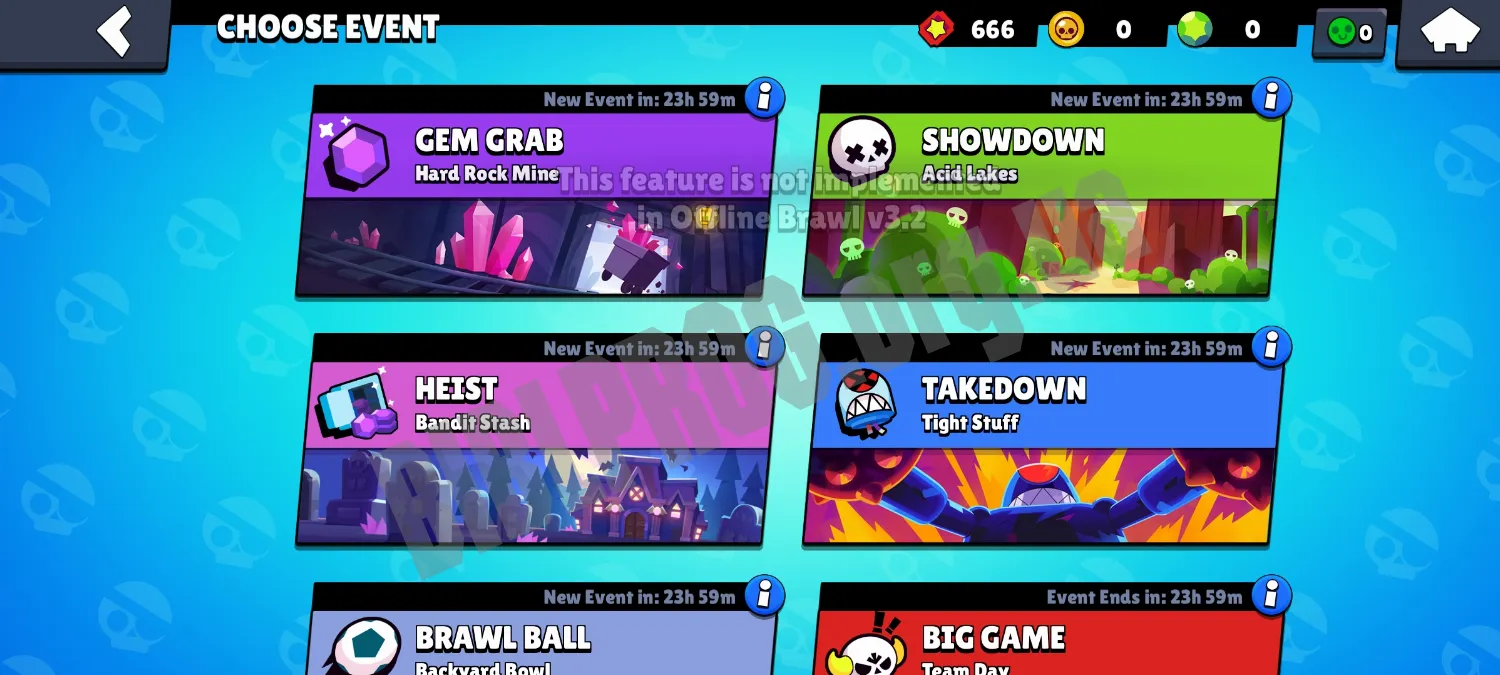 Ключевая особенность заключается в том, что на сервере можно играть без подключения к интернету. Также здесь разблокированы абсолютно все бравлеры (32 бойца). В наличии широкий выбор игровых режимов, поэтому игра будет максимально насыщенной.