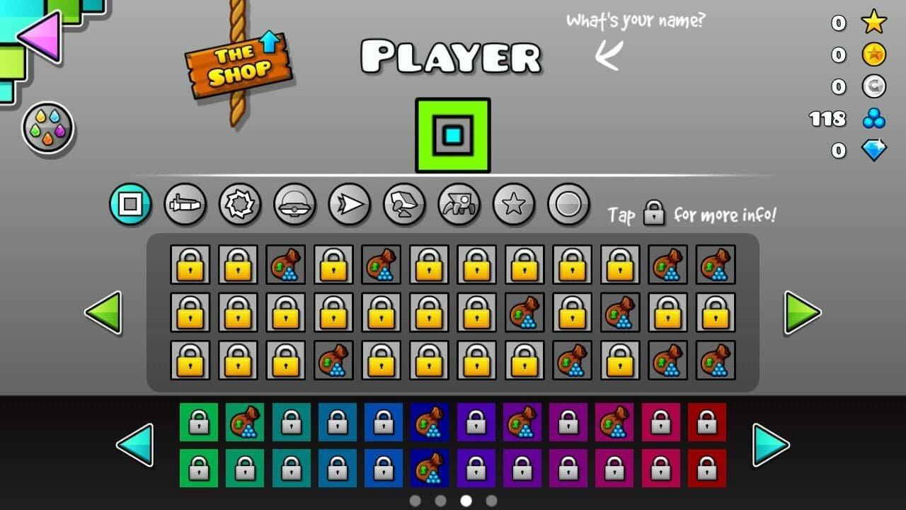 Вы можете изменять внешний вид игрового персонажа. Например, у вас есть возможность сменить основной и дополнительный цвета, формы куба, летающего корабля, летающей тарелки, робота, паука и многое другое. В игре присутствуют достижения и ежедневные задания, за которые вы получаете особые награды. Благодаря этому у пользователей появляется стимул продолжать игру и соревноваться с другими игроками.