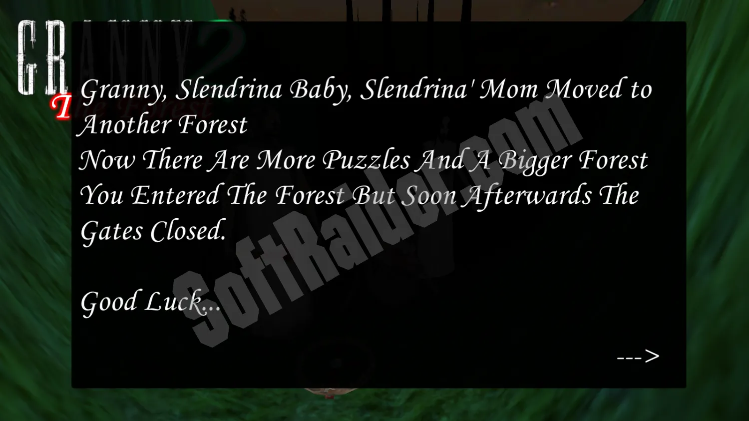 Granny The Forest: Chapter Two переносит действие в новый лес, куда перебрались Гренни, младенец Слендрины и сама Слендрина. Локация стала больше, сложнее и насыщеннее элементами, которые нужно изучать, чтобы не попасться врагам. С первых минут игрок оказывается в ловушке: ворота захлопываются, и единственный путь к спасению — исследовать территорию и собирать необходимые предметы.