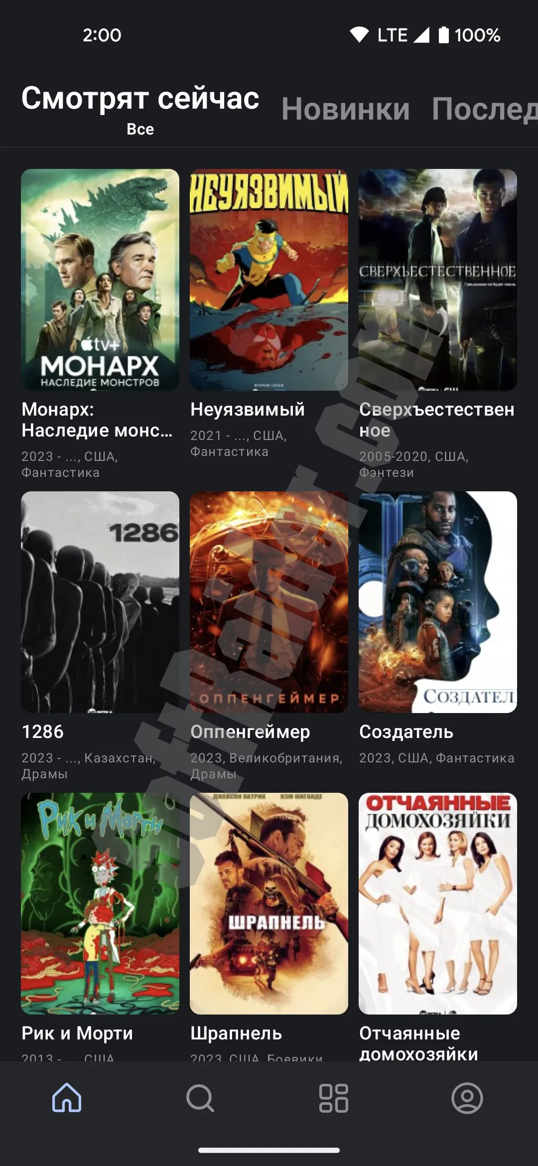 Главный экран приложения организован в виде наглядных подборок: «Смотрят сейчас», «Новинки», «Последние поступления», «Популярное» и «Анонсы». Контент можно фильтровать по типу и быстро находить интересующие позиции. Поиск работает оперативно и охватывает всю базу ресурса, что позволяет за считанные секунды найти нужный фильм или сериал.