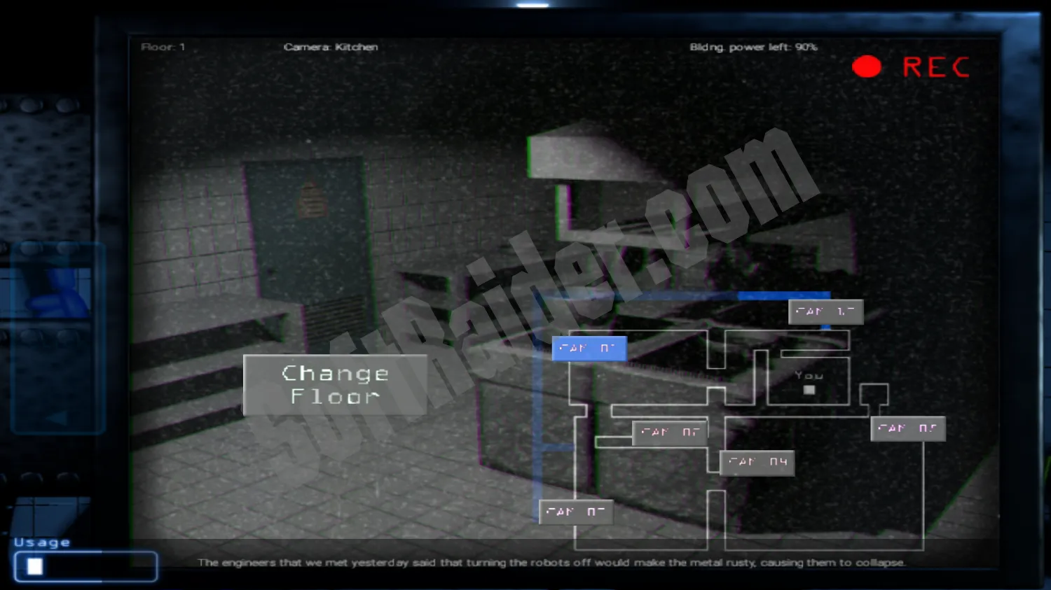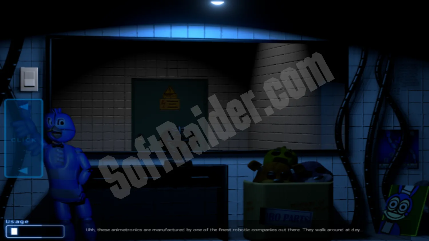 Геймплей строится вокруг контроля единственного входа в офис и окна, через которое можно подсветкой заранее заметить приближение роботов. Игрок работает с двумя панелями: камеры наблюдения и управление генератором, а ключевое ограничение — энергия (250% суммарно: аккумулятор и генератор), которую нужно грамотно перераспределять. В здании два этажа, аниматроники стартуют сверху и спускаются либо лифтом, либо по вентиляциям. Их продвижение можно сдерживать, отправляя лифт обратно на второй этаж кнопкой «Сменить этаж» и перекрывая вентиляции, но любая ошибка или перерасход энергии приближает неизбежную атаку.