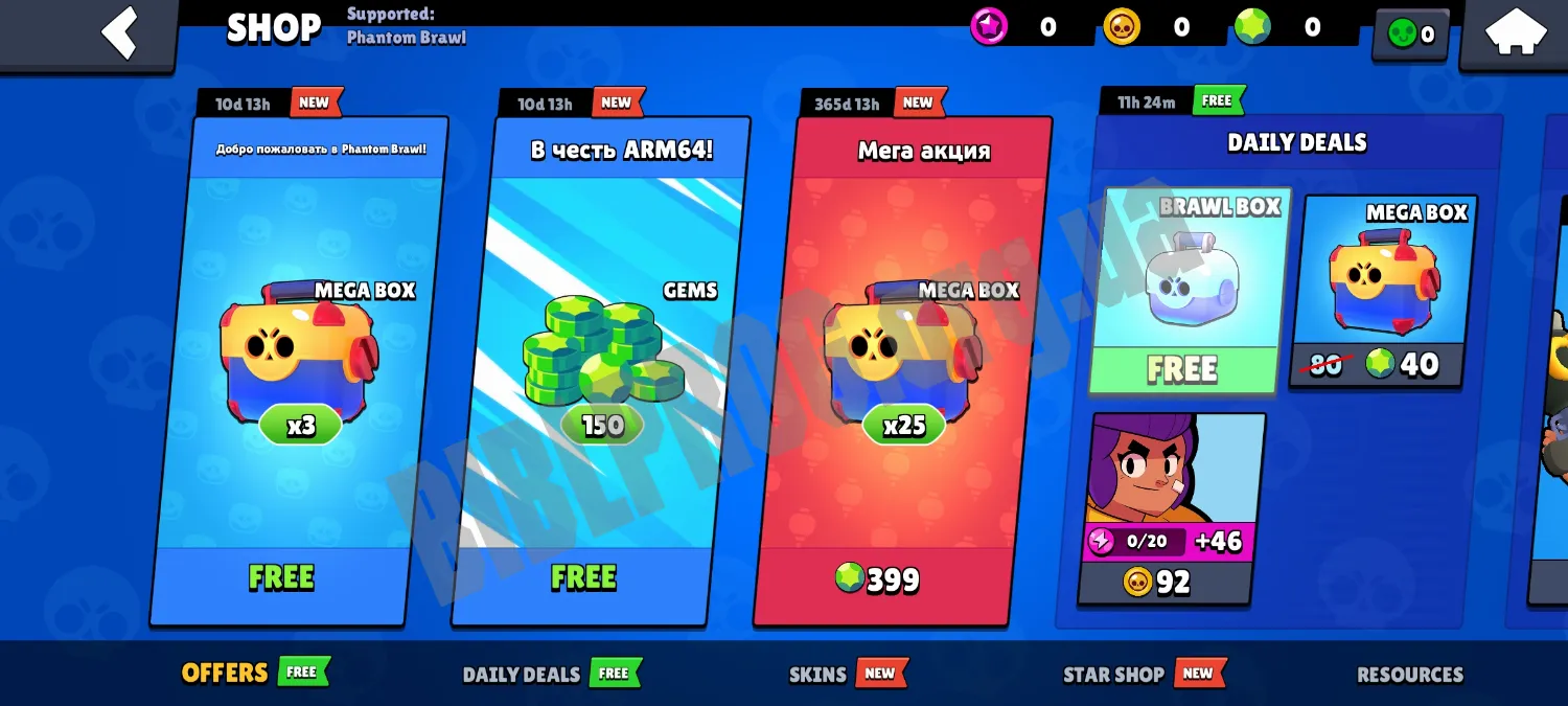 Phantom Brawl — приватный сервер Brawl Stars для Android-устройств. Проект основан на 29-й версии БС, распространяется бесплатно и может устанавливаться параллельно с оригинальным клиентом. Разработчики делают акцент на доступности контента и дополнительных возможностях для прокачки. На сервере есть все для насыщенного динамичного геймплея: Магазин, Путь к славе, Brawl Pass, Клубы, Таблицы лидеров и многое другое.