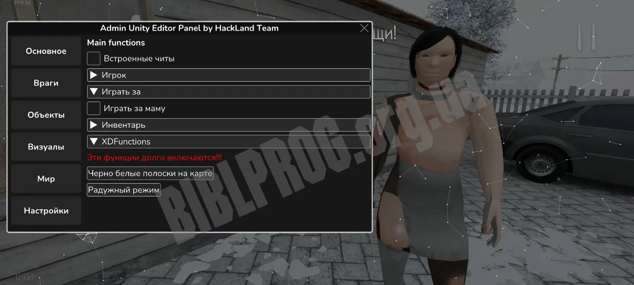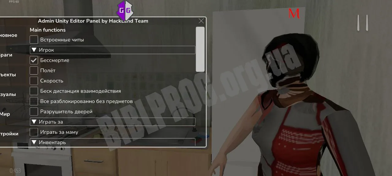 Установив мод на свое Андроид-устройство, вы получите максимально расширенные возможности для модификации геймплея. Доступны встроенные читы, включая бессмертие, полет, увеличенную скорость, а также возможность взаимодействовать с объектами на любом расстоянии. Игрок может переключаться между различными персонажами, в том числе играть за маму, а также использовать функции разрушения дверей. Панель позволяет управлять инвентарем, изменять скин в реальном времени, активировать визуальные эффекты вроде радужного режима и черно-белых полос на карте. Кроме того, можно задать свои настройки, включить глюки и даже сломать игровое время.