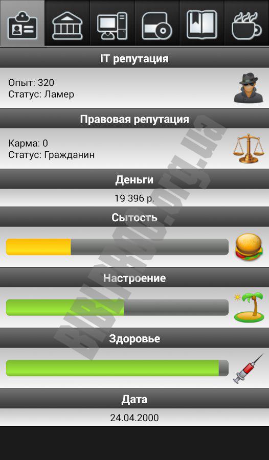 В начале игры вам предоставляется персонаж с нулевым опытом работы, отсутствием навыков в данной сфере и денежным запасом 100 рублей. Во время процесса прохождения следите за его жизненными показателями. Они отображаются в виде полосы здоровья и процентом соотношении.