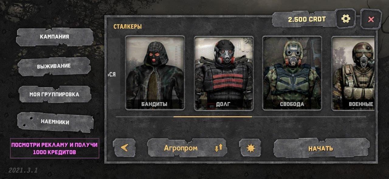 Вам доступны два режима игры – «Кампания» и «Выживание». Для начала игры в кампании вам необходимо выбрать группу людей, за которых вы будете играть. Например, сталкеры, бандиты, экологи и многие другие. Также вам предлагается выбрать сложность игры – стандартную, либо сложный режим. В кампании вам необходимо выполнять задания, собирать ресурсы и захватывать территории. В режиме выживания ваша задача выжить, защищаясь от волн мутантов.